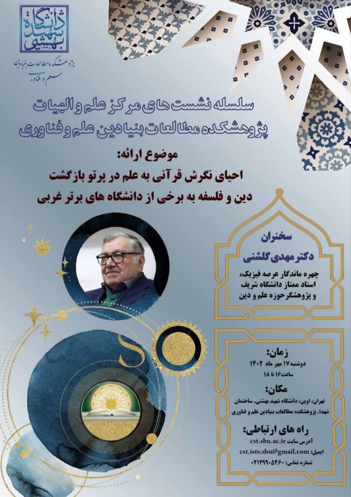 سلسله سخنرانيهای علم و الهیات با موضوع «احیای نگرش قرآنی به علم در پرتو بازگشت دین و فلسفه به برخی از دانشگاه های برتر غربی» دوشنبه 17 مهر 1402 برگزار می شود. این نشست توسط مرکز”علم و الهیات” پژوهشکده مطالعات بنيادين علم و فناوری دانشگاه شهیدبهشتی برگزار می شود. دکتر مهدی گلشنی، چهره ماندگار عرصه فیزیک، […]